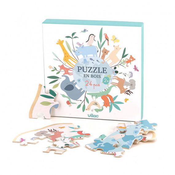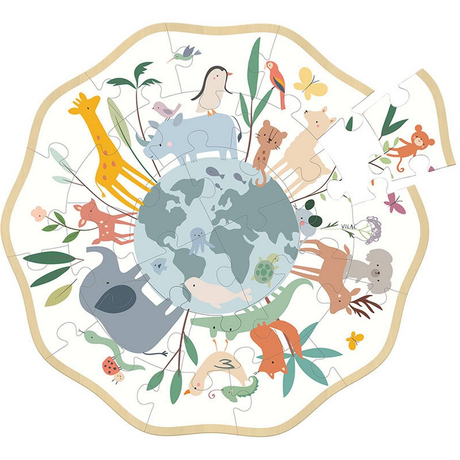 Ce puzzle en bois de chez Vilac est de forme ronde et représente la Terre entourée des animaux du monde. Il se compose de 24 pièces.